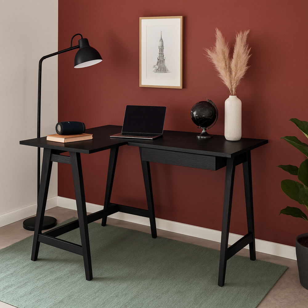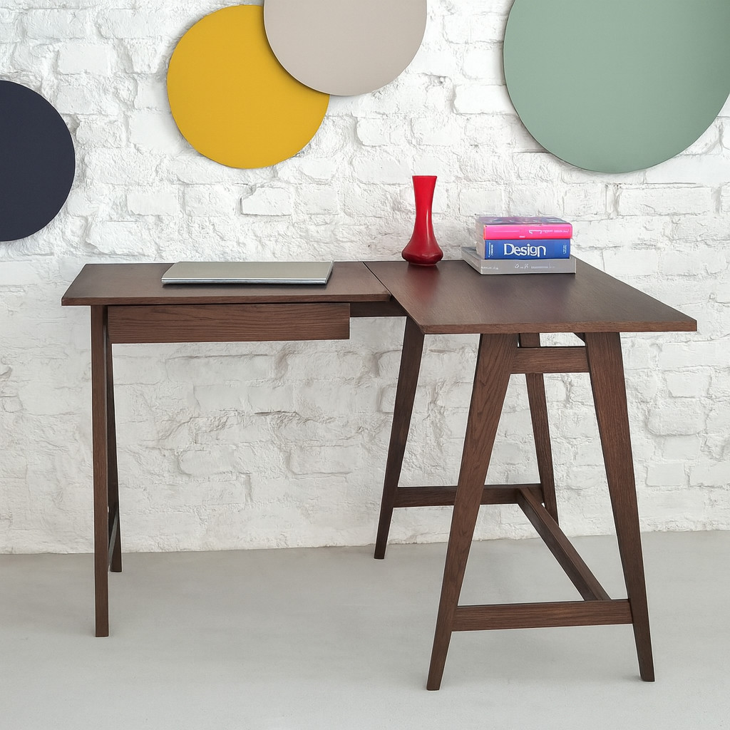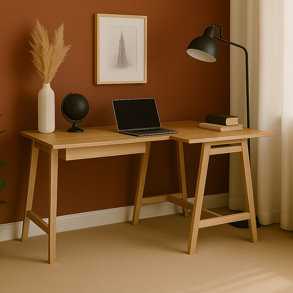 W tych wymiarach idealnie mieści się nasze narożne biurko Luka, które jest doskonałym rozwiązaniem do jednoczesnej pracy z laptopem i dokumentami lub jeśli chcesz korzystać z dwóch monitorów na raz. Biurko w kształcie litery L dostępne jest w dwóch szerokościach: