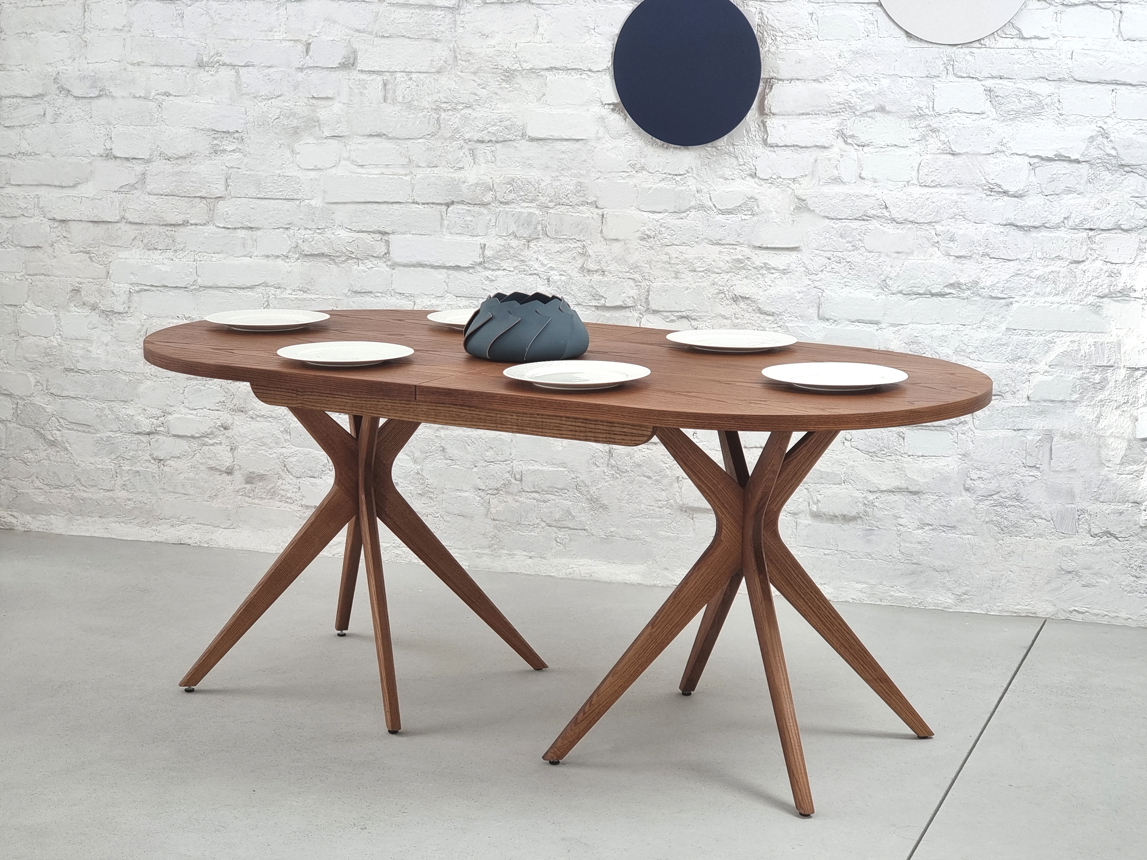 Elegancji doda również owalny stół jadalniany Jubi. Jego niewielka szerokość oznacza, że zajmuje mniej miejsca, oferując jednocześnie miejsca siedzące dla 2 lub 4 osób. Mały owalny stół Jubi to stylowy, kompaktowy stół do jadalni, który doskonale pasuje do małych kuchni.