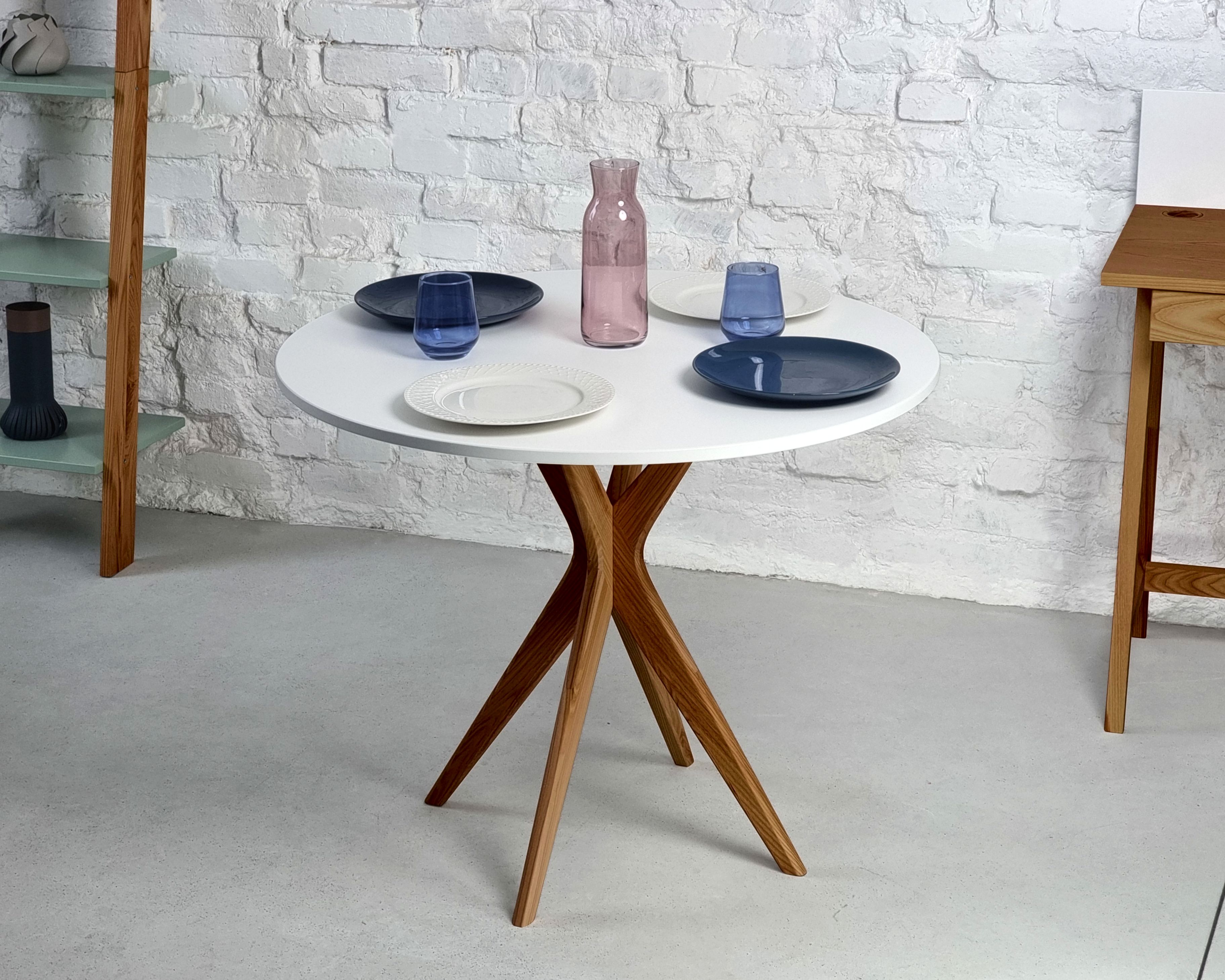 - Do kuchni – Jubi okrągły stół jadalniany 90cm z białym blatem i drewnianymi nogami. Ten stół jadalniany do małych pomieszczeń idealnie sprawdzi się jako stół jadalny dla 4 osób, oferując zarówno komfort, jak i funkcjonalność. Konstrukcja stołu na cokole pozwala na swobodne wykorzystanie wszystkich krawędzi blatu, zachowując jednocześnie lekki i elegancki wygląd.