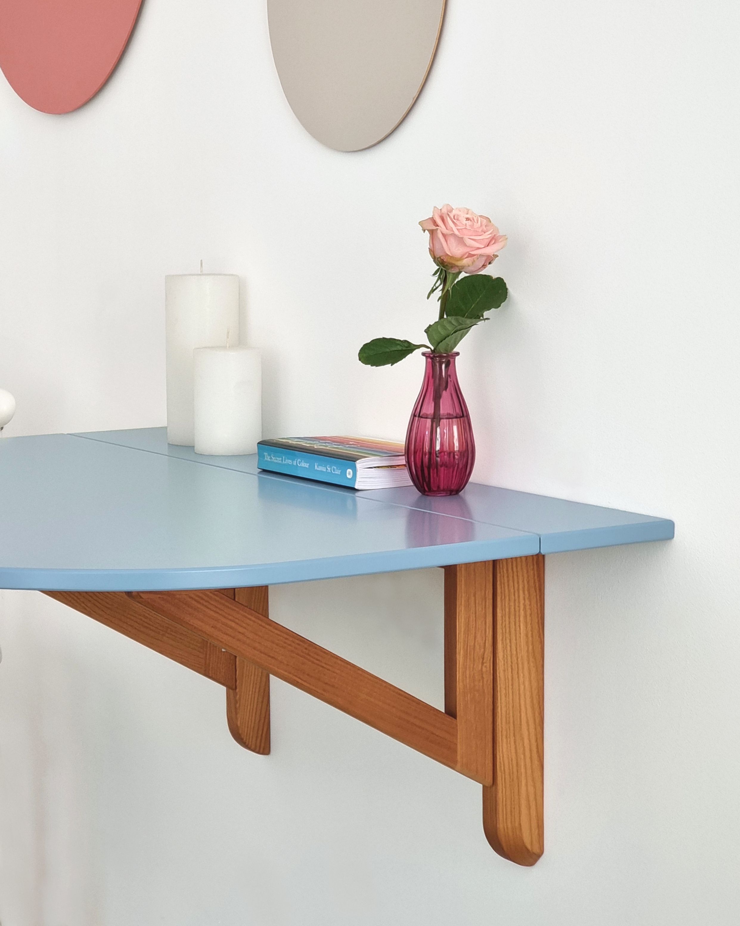 Wąski, składany stół Klapp łączy w sobie elegancki design z ponadczasowym stylem. Niezależnie od tego, czy używasz go jako stołu jadalnianego, biurka, czy kreatywnego kącika, dopasuje się do Twoich potrzeb i sprawi, że życie w małej przestrzeni stanie się funkcjonalne i wygodne.