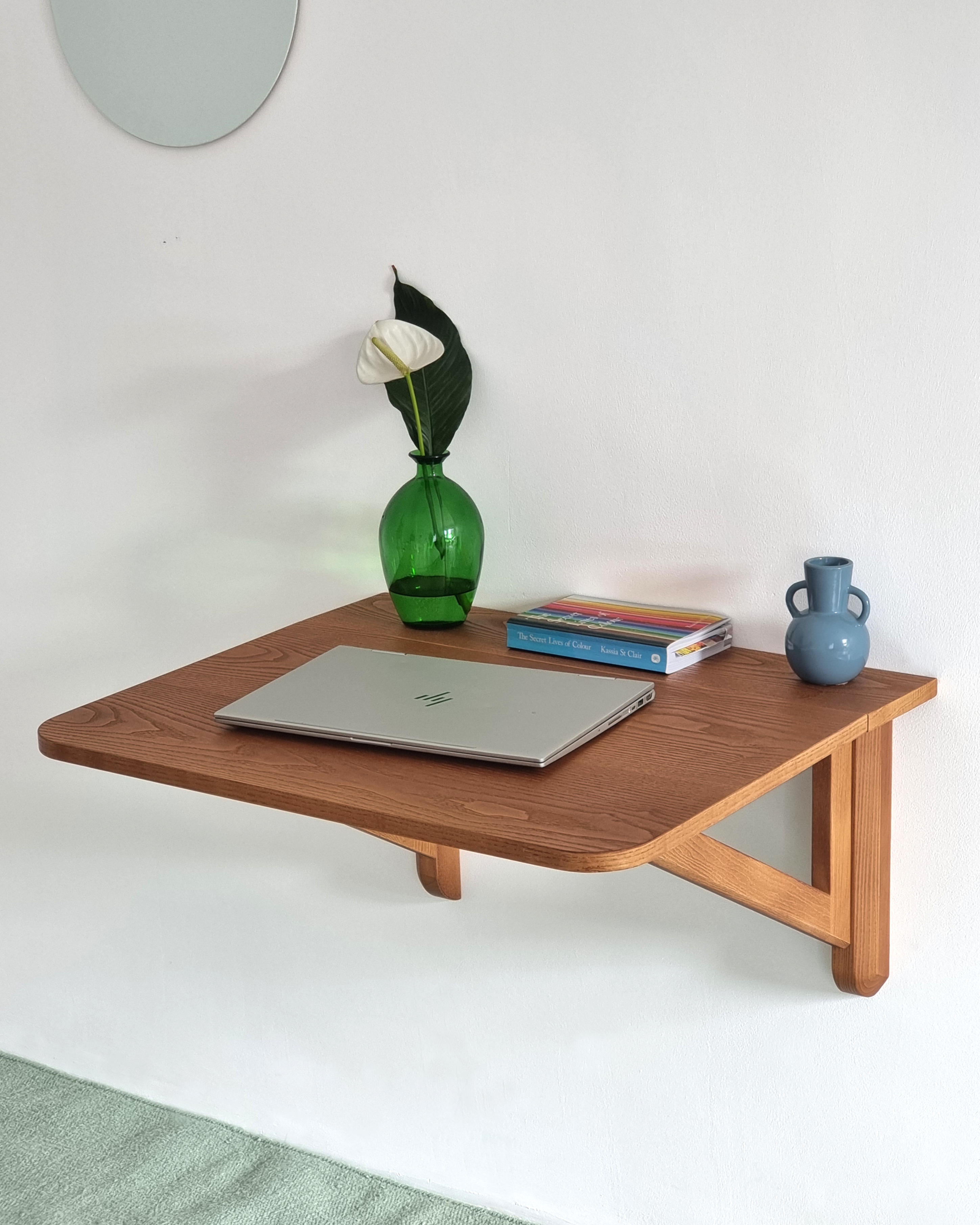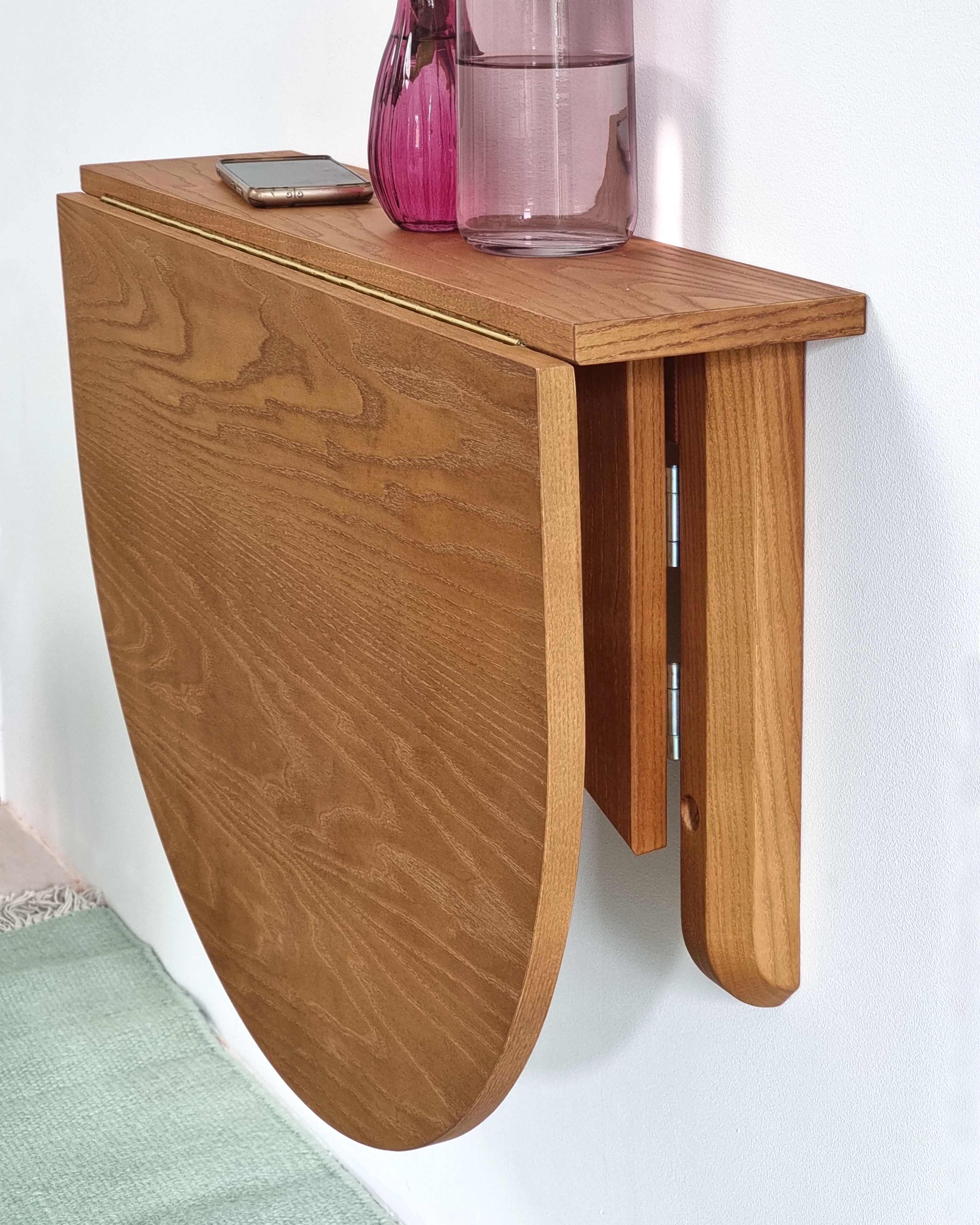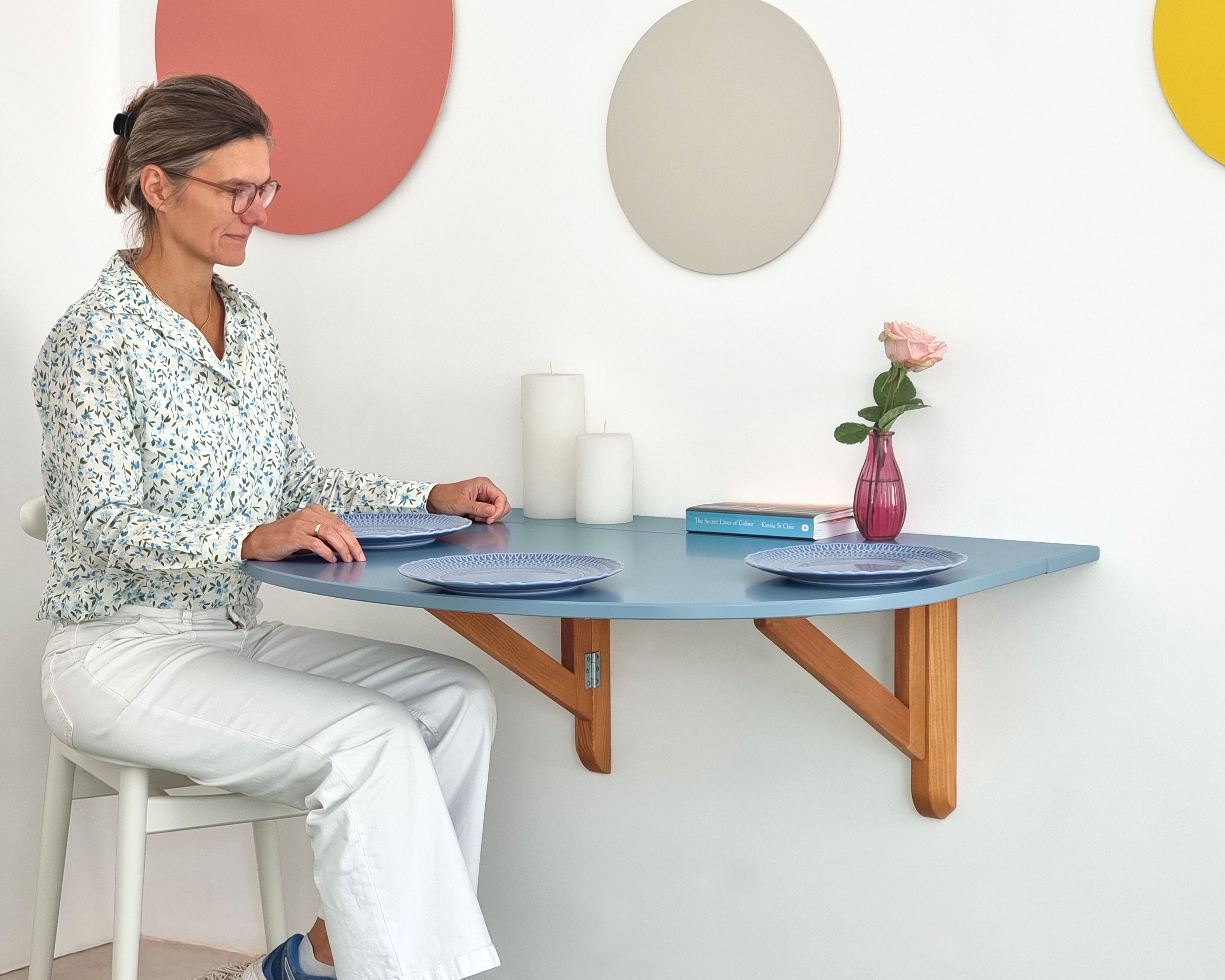 Mały składany stół Klapp to wszechstronny mebel, który z łatwością zmieści się w kuchni, salonie lub sypialni. Stół jest montowany do ściany i rozkłada się w kilka sekund, tworząc natychmiastowe miejsce do pracy lub zjedzenia szybkiego posiłku. Gdy nie jest używany, można go złożyć płasko przy ścianie, zwalniając cenną przestrzeń.