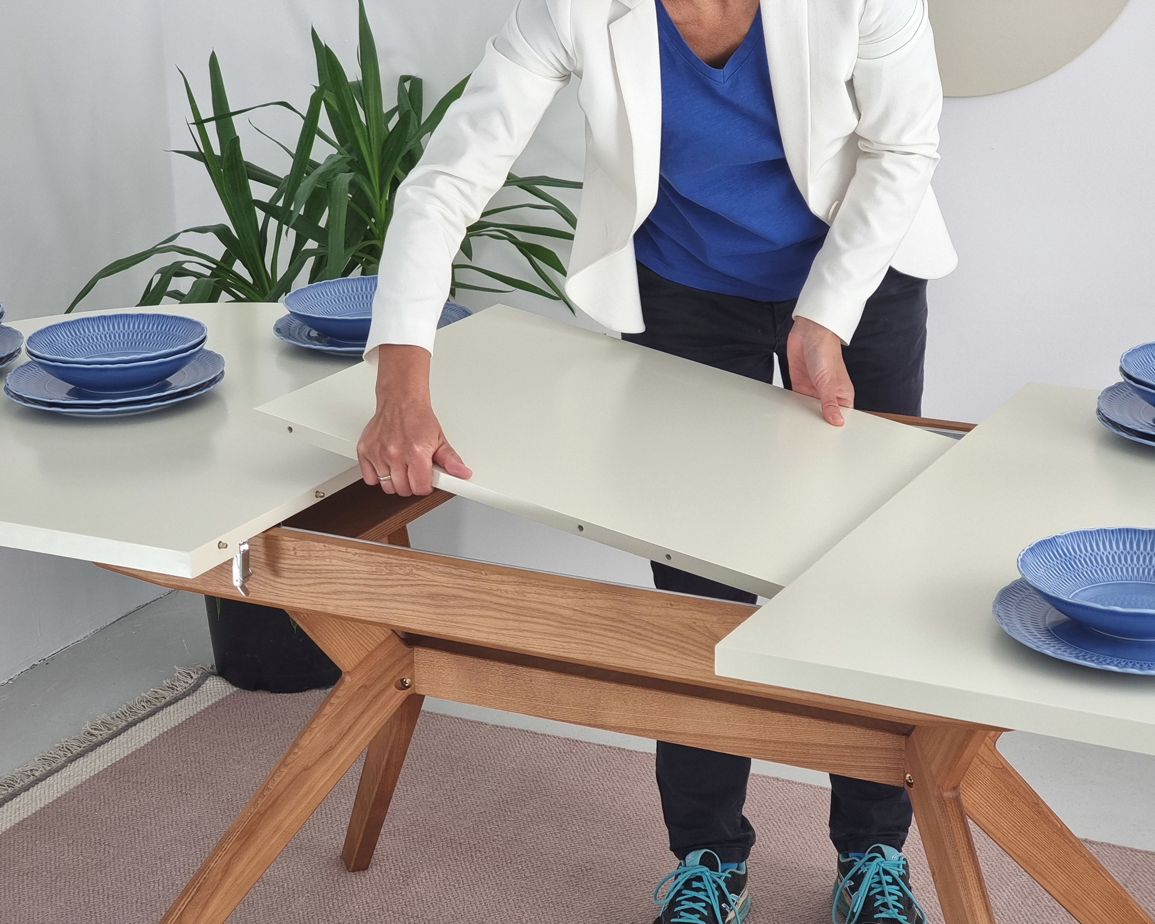 Każdy szczegół tego rozkładanego owalnego stołu został starannie przemyślany. Nogi są ustawione tak, aby zmaksymalizować przestrzeń pod stołem i sprawić, żeby każdy centymetr blatu mógł być wykorzystany.