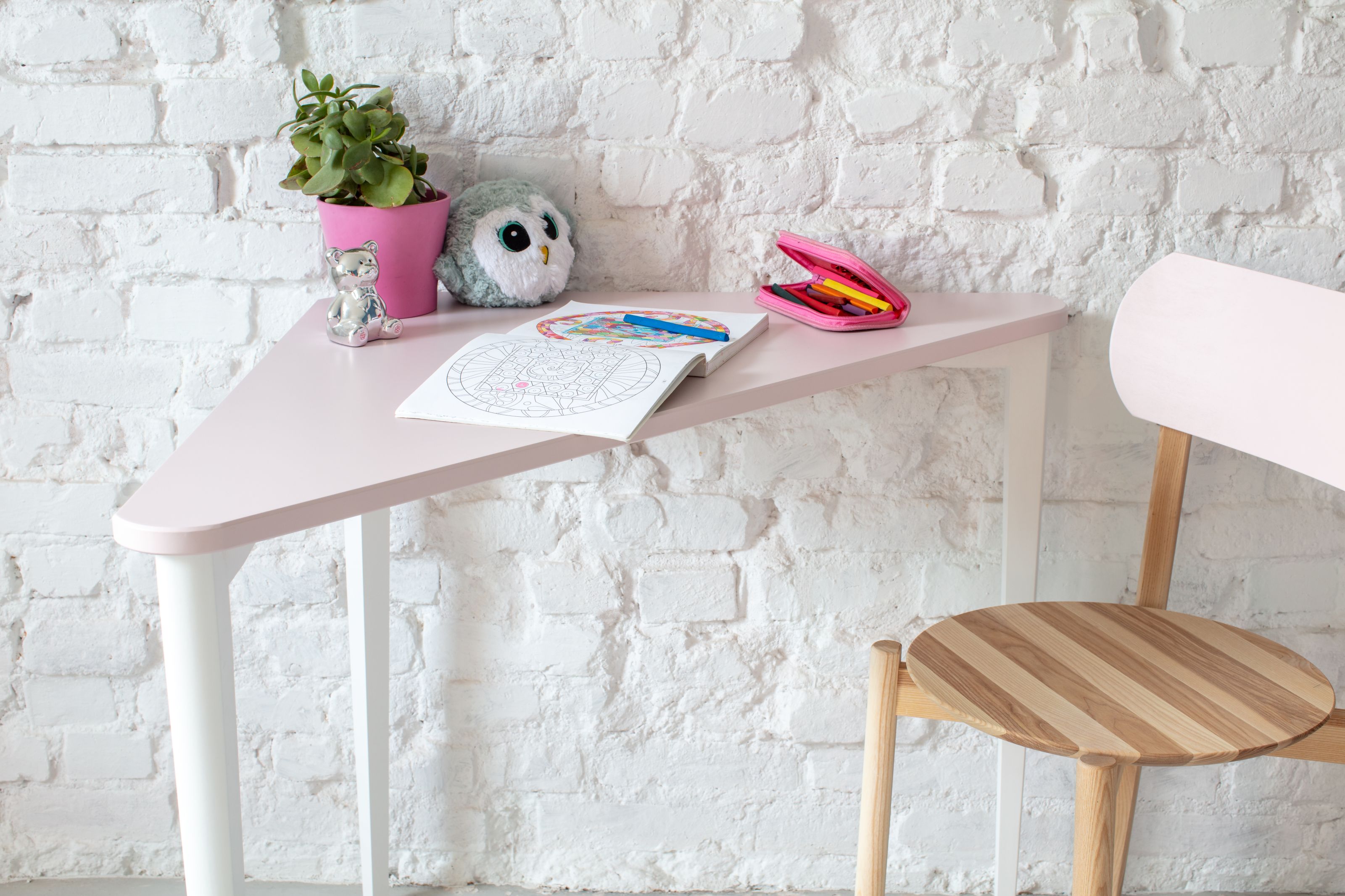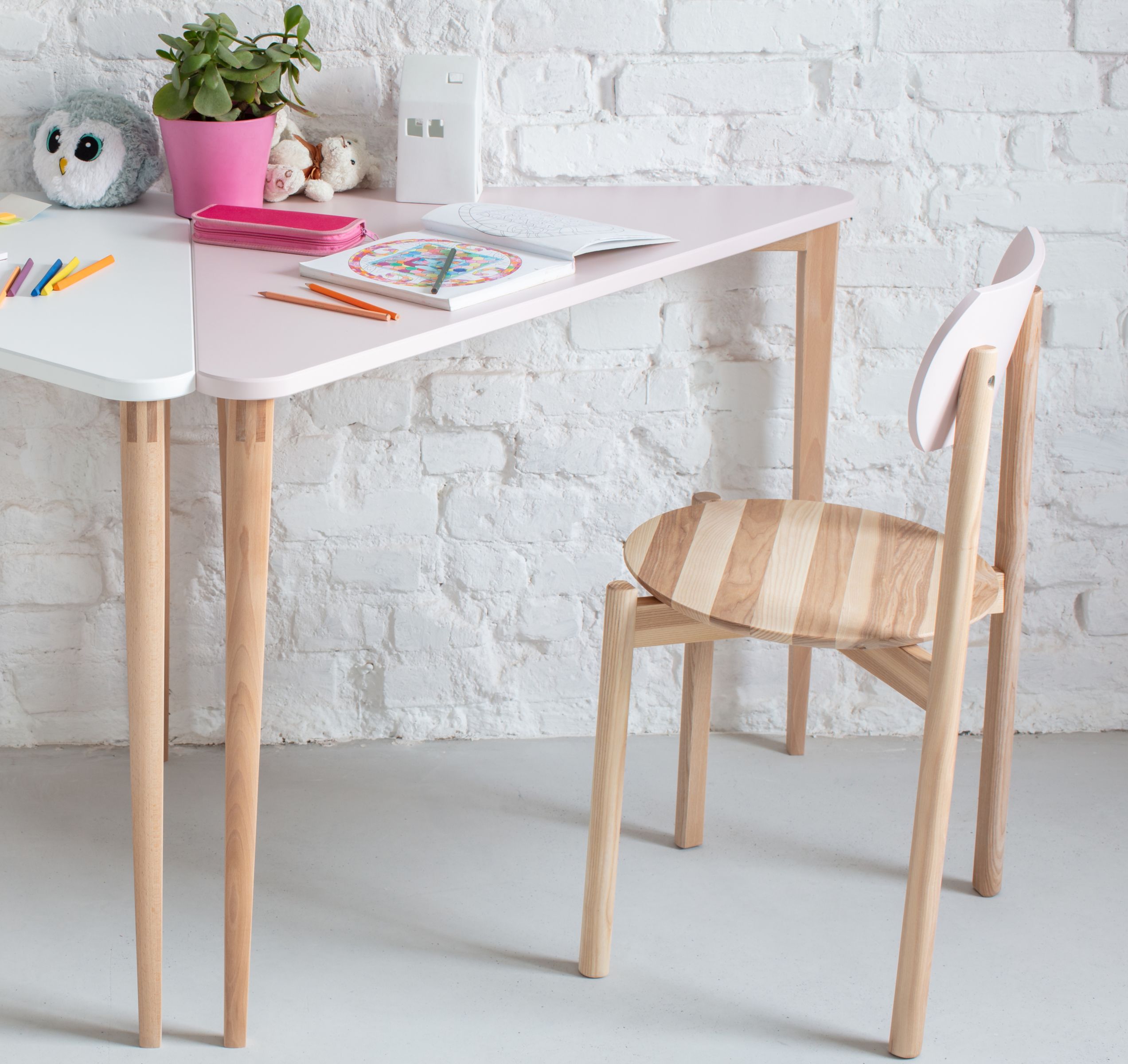 Pomimo kompaktowej formy, Naja zapewnia dużą powierzchnię roboczą - idealną do zadań komputerowych, nauki, a nawet gier. Bez trudu wkomponuje się zarówno w nowoczesne, jak i przytulne wnętrza. Wykonane z trójkątnego blatu wspartego na trzech nogach z litego drewna bukowego, to biurko narożne sprawdza się również we wspólnych pokojach dziecięcych – umieszczając 2 biurka tyłem do siebie możesz stworzyć niestandardowe podwójne stanowisko pracy.