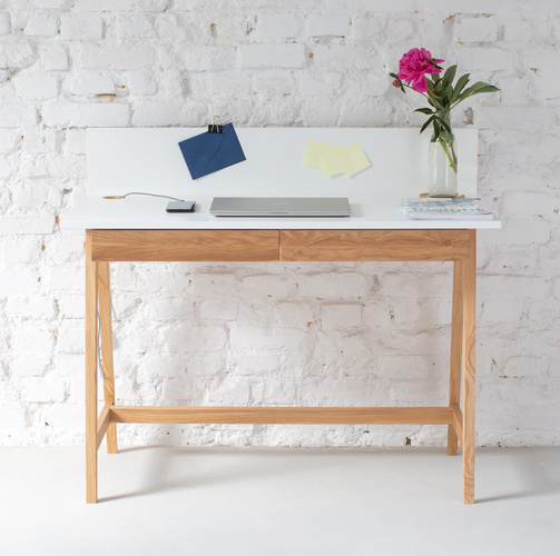 Małe biurko Luka świetnie sprawdzi się w niewielkich przestrzeniach. Funkcjonalne szuflady pomagają utrzymać czysty i zorganizowany blat biurka. Dodatkowy panel to miejsce na najważniejsze notatki. Zrównoważona produkcja w Polsce.
