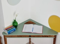 Blat osadzony jest na 3 nogach wykonanych z solidnego drewna, tak samo jak szuflada i otwór na kable. To kompaktowe biurko stworzy narożne miejsce pracy w Twoim salonie czy małym pokoju. Biurko narożne Ashme to nie tylko funkcjonalny mebel, ale również element wnętrza który doda elegancji i ciepła wnętrzu.