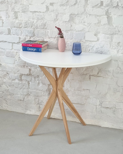Jubi to półokrągły rozkładany stół, który może służyć jako konsola do przedpokoju lub mały jadalniany stół. Ten niewielki 2 osobowy stół, z łatwością przekształca się w mały stół dla 4 osób. Zrównoważona produkcja w Polsce.