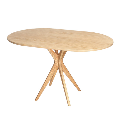 Jubi to owalny stół jadalniany z drewnianymi nogami i blatem wykonanym z płyty MDF fornirowanej naturalnym jesionem. Świetne rozwiązanie dla niewielkich pomieszczeń. Stół dostępny w wielu wybarwieniach drewna. Zrównoważona produkcja w Polsce.